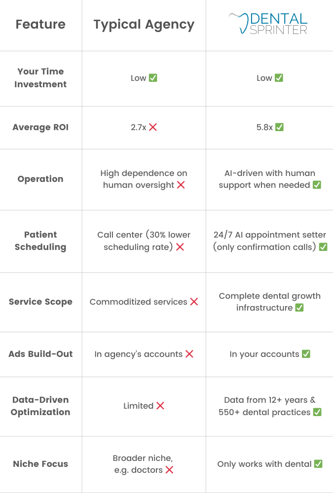 Yes, our system absolutely works even when using another marketing agency. We understand that most dental practices are already doing a lot of things to market and that’s why we’ve designed our system to “snap on” to what they’re already doing.