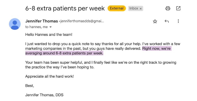 Consistently hitting 10-15 new patients per week, with full control of their own marketing.